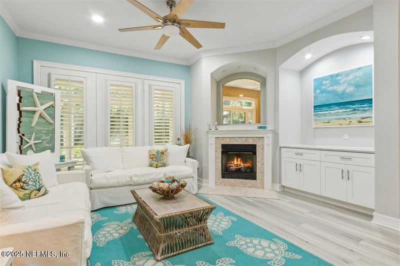 Listing details for 95024 Barclay Pl #4A, Fernandina Beach, FL 32034 : Nestled within gated Harrison Cove community on Amelia Island, this beautifully updated villa invites you to embrace easy coastal living. Renovated throughout in 2022, the home showcases a bright, open floor plan with 10-ft ceilings, cozy fireplace, and sunroom that flows seamlessly to private outdoor space. The chefs kitchen is a standout, offering Cambria Quartz countertops, custom wood cabinetry with crown molding & soft-close drawers, striking tile backsplash, premium LG appliances, custom hood, & built-in pantry. The primary suite has been thoughtfully redesigned with spa-inspired bath featuring large walk-in shower, dual vanities, & custom closet shelving. Enjoy convenience of one-car garage, laundry room, & outdoor living with grass, patio, & tall privacy hedges. Just a short golf cart ride away, you will find the beach, boutique shops, and restaurants, all within the tranquility of Amelia Islands south end.