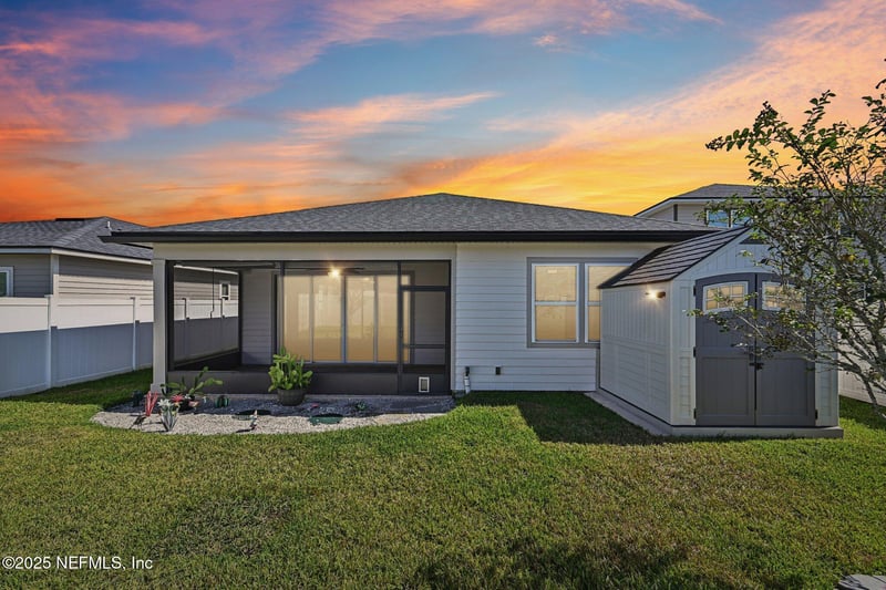 Listing details for 95451 Woodbridge Pw, Fernandina Beach, FL 32034 : Beautifully maintained 4BR/2BA home in the Village of Woodbridge, Nassau County. This 1,811 sq ft home features lots of upgrades, including custom crown molding throughout, eye-catching designer light fixtures, and an open-concept layout that flows effortlessly from room to room. The kitchen features striking granite countertops, sleek black appliances, a bold mosaic tile backsplash, and a spacious island with pendant lighting—perfect for both casual meals and entertaining. The living room features a Hunter-Douglas sun-shade curtain and a surround sound system. The primary suite features a walk-in closet and an en-suite bathroom with dual sinks, custom-framed mirrors, and a walk-in shower. Enjoy the screened-in back patio and fully fenced backyard with gates on both sides and a tool shed. Includes indoor laundry with washer/dryer, irrigation system, water softener, security system, and durable floor coatings in the garage and patio. Move-in ready and full of upgrades