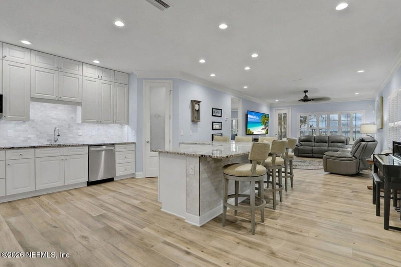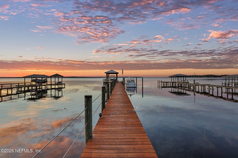 Listing details for 9551 County Road 13, St Augustine, FL 32092 : The river is the jewel of this home. Newly constructed in 2024 and set along the St. Johns River with 50 feet of prime frontage, this 4-bedroom, 2.5-bath property is designed for those who want to fully embrace waterfront living—boating, relaxing, and taking in unforgettable sunsets right from their backyard. Your private dock and boating setup are exceptional, featuring a 10,000-lb boat lift, 50-amp marine power, treated water, jet ski lift, and accommodations for up to a 50' yacht. The expansive 450-ft dock includes oversized custom pylons and 50,000-lb stainless steel tide slides, while the PVC vinyl bulkhead is just four years old. Shallow water near the property makes navigation easy, and you're only about two miles by boat or car to Outback Crab Shack for casual riverfront dining. Inside, panoramic water views fill the main living areas and the primary suite, which is conveniently located on the first floor. The suite offers a soaking tub, glass walk-in shower, and spacious custom closet. The open-concept layout features 10' ceilings, tile flooring on the main level, wood floors upstairs, and an inviting flow designed for everyday living and entertaining. The kitchen includes a large granite island, gas cooktop, stainless appliances, walk-in pantry, and tankless water heater. Upstairs are three guest bedrooms, a Jack-and-Jill bath, and a loft with custom built-ins. Built for comfort and efficiency, the home sits on a stem wall foundation elevated 3 feet above the FEMA flood plane and includes an 18kW Generac whole-home generator, 380' artesian well with treatment system, foam-sealed attic, and plantation shutters throughout. Storage and functionality are abundant with an attached two-car garage featuring attic storage and organizational systems, plus a detached garage with cooling fans and dehumidifier. The backyard is ready for your vision, already equipped with water, electric, and gas lines for a future pool.