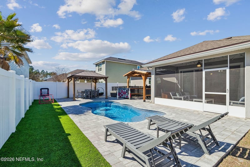 Listing details for 96048 Breezeway Ct, Yulee, FL 32097 : Tucked away in a PRIVATE DOUBLE CUL-DE-SAC neighborhood surrounded by mature TREES, this well appointed 4-bedroom, 2-bath home offers the perfect blend of comfort, curated design, and coastal convenience. Situated on a desirable CORNER lot, this home welcomes you with charming CURB APPEAL and thoughtful layout throughout. Inside, enjoy ACCENT WALLS with FRESH PAINT and LUXURY VINYL PLANK flooring that flows seamlessly through the main living areas, complemented by an UPGRADED KITCHEN featuring stylish finishes and a functional layout for everyday living and entertaining. The living room is anchored by a coastal TILED FIREPLACE with CUSTOM BUILT-IN bookshelves, creating a warm and inviting focal point. Both bathrooms have a fresh, MODERN feel. Step through the TRIPLE POCKET SLIDER into your own BACKYARD RETREAT featuring a SALTWATER POOL, expansive PAVER PATIO, TILED SCREENED PORCH, ASTROTURF play area, and multiple covered ENTERTAINING areas--perfect for relaxing, hosting friends!