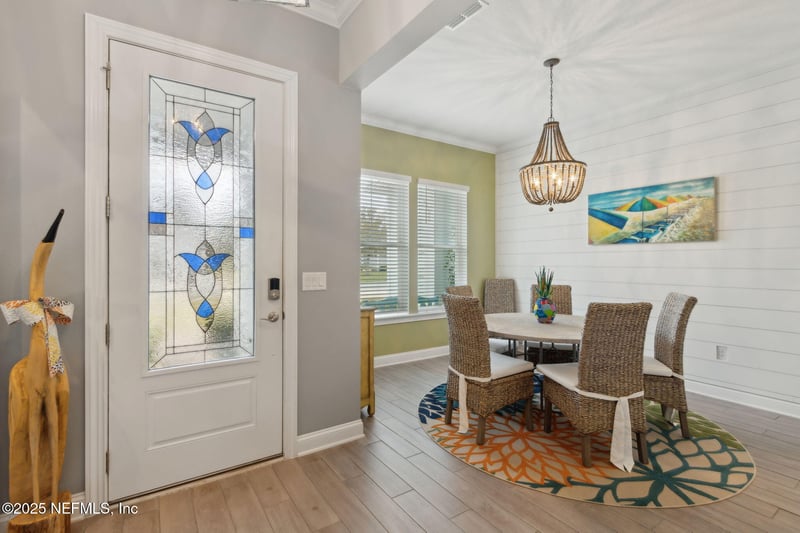 Listing details for 96336 Grande Oaks Ln, Fernandina Beach, FL 32034 : Gated Amelia Riverwalk - Beautifully maintained 4-bedroom, 2-bath coastal retreat blends comfort, style, and location. Step inside to a bright, open floor plan with soaring 10-foot ceilings, 8-foot doors, and plenty of natural light. The gourmet kitchen steals the show, featuring Electrolux stainless appliances, quartz countertops, glass-tile backsplash, and soft-close cabinetry—perfect for those who love to cook or entertain. Enjoy designer touches throughout: wood-look tile, tray ceilings, crown molding, and a touch of shiplap charm in the dining area. Four-panel stacking glass doors open to your covered porch and screened paver patio, ideal for relaxing evenings or weekend gatherings around the custom fire pit. There's plenty of space to add a pool and still have room to play. The owner's suite offers a spa-inspired escape with a soaking tub, walk-in shower, dual vanities, and a roomy walk-in closet. All just minutes from Amelia Island. Low HOA - NO CDD fees.