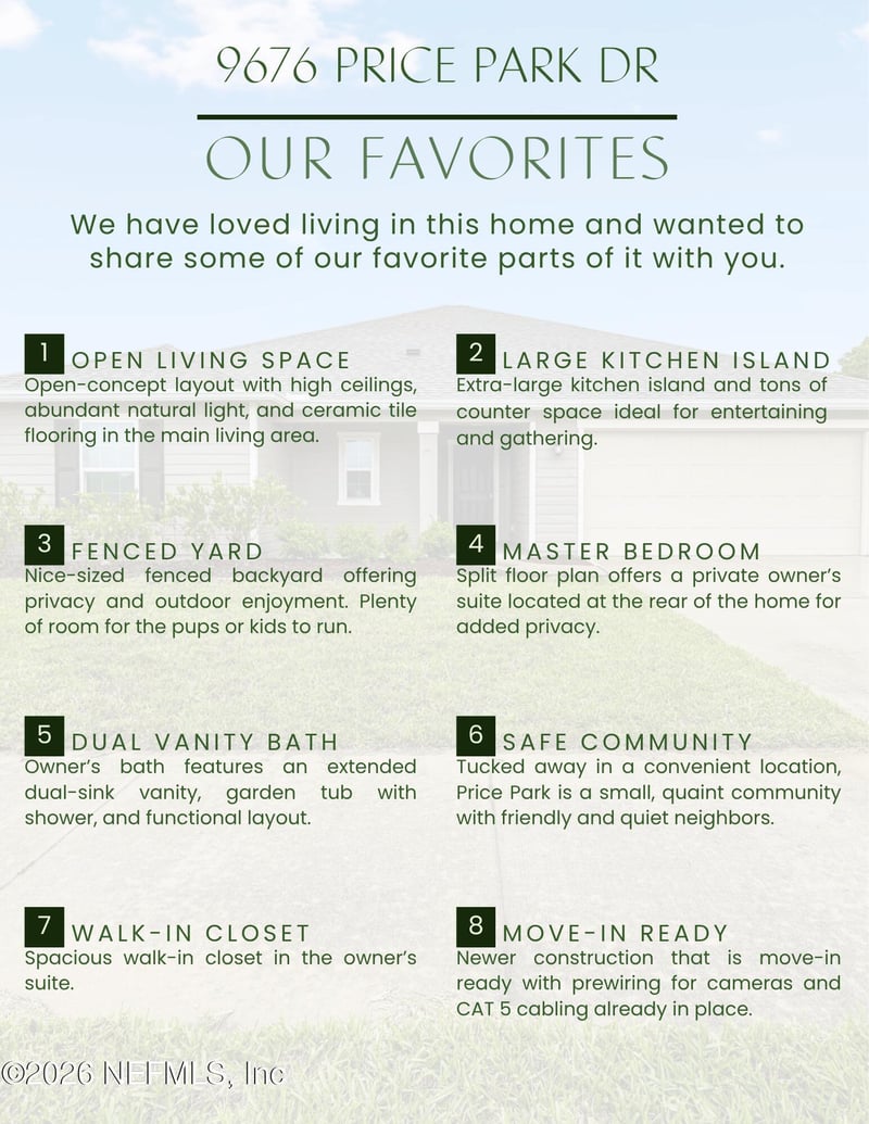 Listing details for 9676 Price Park Dr, Jacksonville, FL 32257 : Welcome home to this bright and spacious 4-bedroom, 2-bath gem in the sought-after Price Park community! Built in 2019 and thoughtfully maintained. It being a newer home makes shopping for homeowners insurance simple and stress-free. Step inside to an open layout that flows effortlessly, perfect for hosting friends and family. The modern kitchen opens right into the main living space, so you're always part of the action. Large windows bring in tons of natural light, giving the whole home a warm, welcoming feel. The bedrooms are generously sized and designed with both comfort and functionality in mind, making it easy to settle right in. Outside, you'll find a nicely sized yard with plenty of room to relax and entertain, perfect for weekend BBQs, pets, etc. All of this in a convenient Jacksonville location close to shopping, dining, and major routes so you're never far from where you need to be!