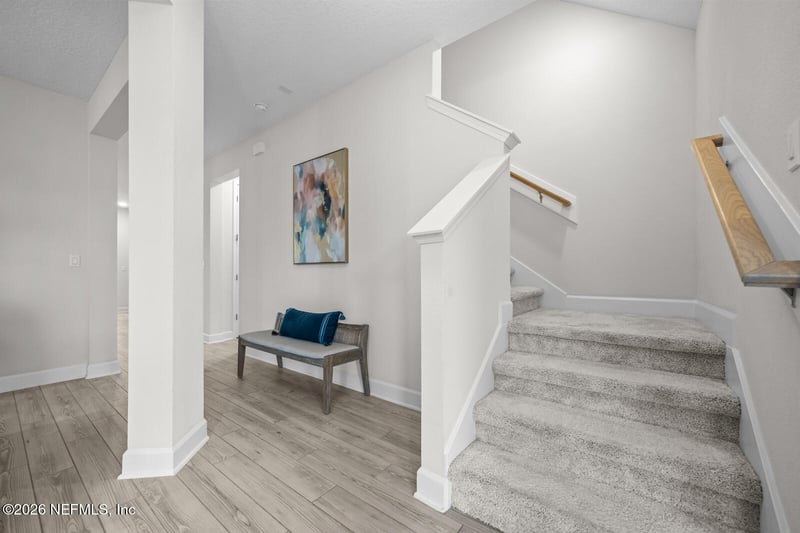 Listing details for 9742 Invention Ln, Jacksonville, FL 32256 : Turn-key, light-filled, and thoughtfully designed, this beautiful two-story home backs to a serene wooded preserve and sits near the end of a quiet street—offering privacy without sacrificing convenience. From the moment you step inside, the tiled foyer welcomes you into an open, airy layout that flows seamlessly from the dining area into the heart of the home: a stunning gourmet kitchen overlooking the great room and breakfast nook. The kitchen features crisp white cabinetry, quartz countertops, stainless steel appliances, a large center island with seating, and a walk-in pantry—perfect for everyday living and entertaining alike. Abundant windows throughout the home capture natural light and peaceful preserve views, creating a bright, inviting atmosphere. The main level includes a full bedroom with adjacent bathroom, ideal for guests, a home office, or multigenerational living. Upstairs, you'll find a spacious owner's suite plus two secondary bedroomsall with walk-in closetsalong with a convenient upstairs laundry room. A versatile flex space with a Murphy bed (no closet) works beautifully as a home office, guest space, or bonus room. Step outside to enjoy your fully fenced backyard with tranquil wooded preserve views, complete with a covered patio and extended paver deckperfect for entertaining or outdoor dining. There's ample space for play, pets, or a backyard playset. Additional highlights include a two-car garage with extra storage and EV outlet, paver driveway, and smart-home features. Located in the highly sought-after eTown community, residents enjoy access to the 5-acre "Recharge" amenity center featuring a resort-style pool with zero entry and lap lanes, fitness center, yoga lawn, rooftop patio, playground, event lawn, gathering spaces, and dog park. Ideally situated between St. Johns Town Center and Flagler Center with easy access to 9B and I-295. Structural warranty provided by builder is good through approx 05/02/2031. Buyer can call Maverick Warranties & Insurance at 727-308-2179 after closing to have transferred in their names. Note - Curtains, Porch Swing & Garage Fridge do NOT convey. Kids playset will stay along with misc smart switches and bulbs. Will be more in detail with interested buyer.