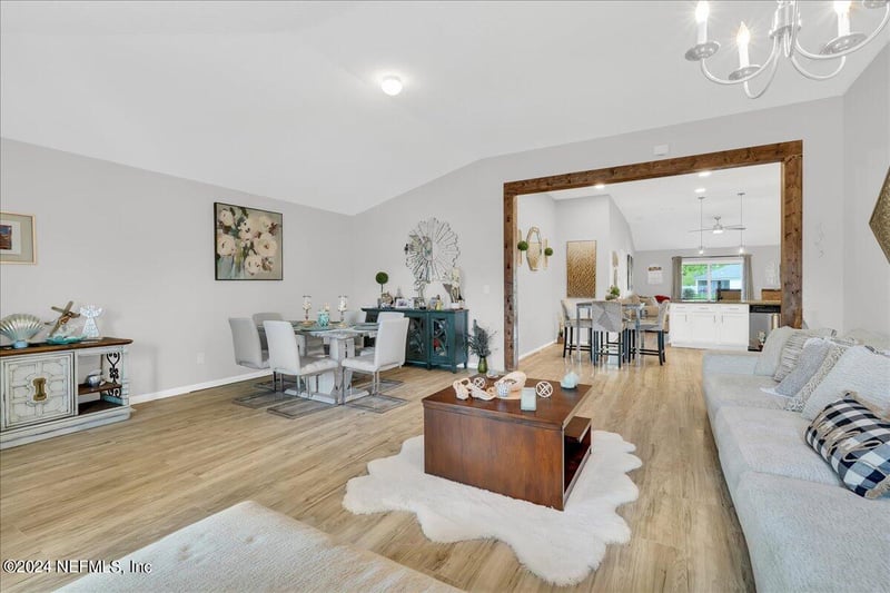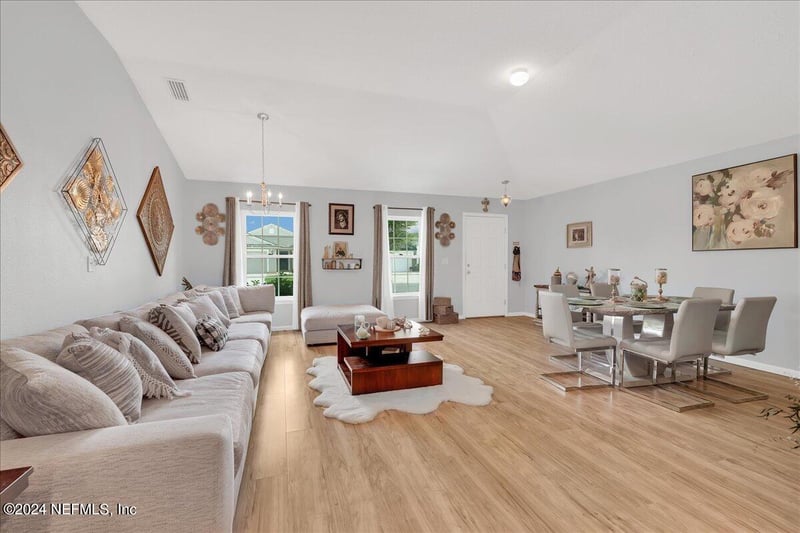 Listing details for 9876 Sailor Dr, Jacksonville, FL 32221 : This stunning single story home with vaulted ceilings boasts an open floor plan that effortlessly connects the living, dining, flex space and kitchen areas. This well-designed space provides a relaxing and entertaining oasis. It is adorned with premium upgrades throughout. The Designer finishes include high ceilings, decorative lighting, upgraded ceiling fans, pendant lighting and custom drapery. The bedrooms provide privacy placing the primary bedroom on the left wing and the other bedrooms on the right wing. Other features include a Large walk in pantry, indoor laundry room, Granite countertops, and stainless steel appliances. The amazing view of the pond can be seen from the kitchen, two of the three bedrooms and the flex space. and is truly picturesque. 3.1% interest rate is assumable with large down payment.