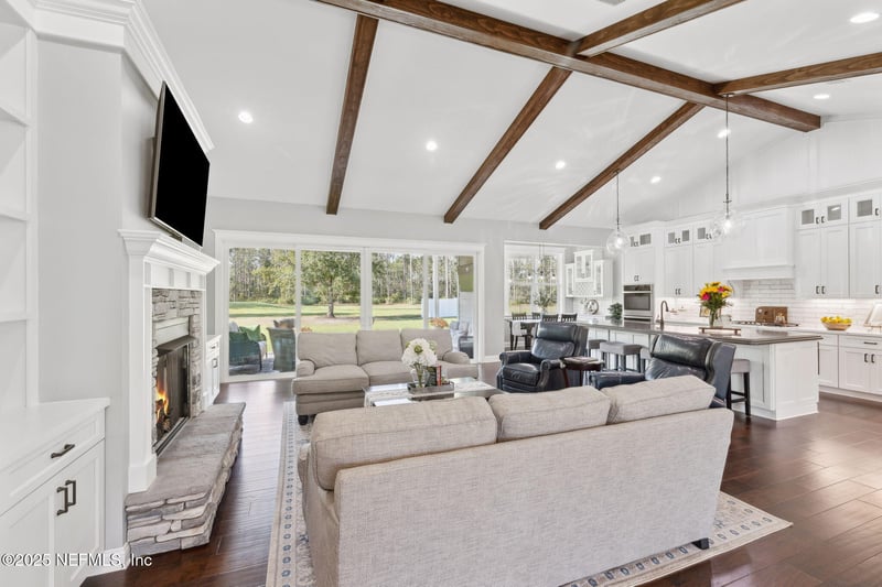 Listing details for 9902 Kings Crossing Dr, Jacksonville, FL 32219 : Custom-Built Elegance. Welcome to 9902 Kings Crossing Drive, a beautifully custom-built residence offering 3 bedrooms, 3.5 baths, on 2.9 acres of privacy in the gated Jacksonville Ranch Club. Built in 2019 and meticulously maintained, this home blends timeless elegance with modern comfort. Throughout the home, you'll find 10-foot ceilings and 8-foot doors, creating an open and elegant flow. The vaulted ceilings in the main living area and kitchen are accented by wood beams and a cozy fireplace, adding warmth and architectural charm. Expansive windows and large sliding glass doors flood the home with natural light and open to a covered back porch, overlooking the backyard and preservation area. The gourmet kitchen offers a gas stove, double oven, abundant cabinetry, and a spacious walk-in pantry, combining style with everyday function. Every detail has been thoughtfully designed, from the upgraded trim package to custom built-ins in every closet. The master suite is a luxurious retreat, complete with dual vanities, a soaking tub, walk-in shower, and generous his-and-her closets. Additional highlights include a whole-home Generac generator, spray foam insulation, a comprehensive water treatment system, and a very large garage with extensive storage. This one-of-a-kind property combines elegance, warmth, and functionalityoffering the perfect lifestyle retreat on nearly 3 acres in one of Jacksonville's most desirable communities.